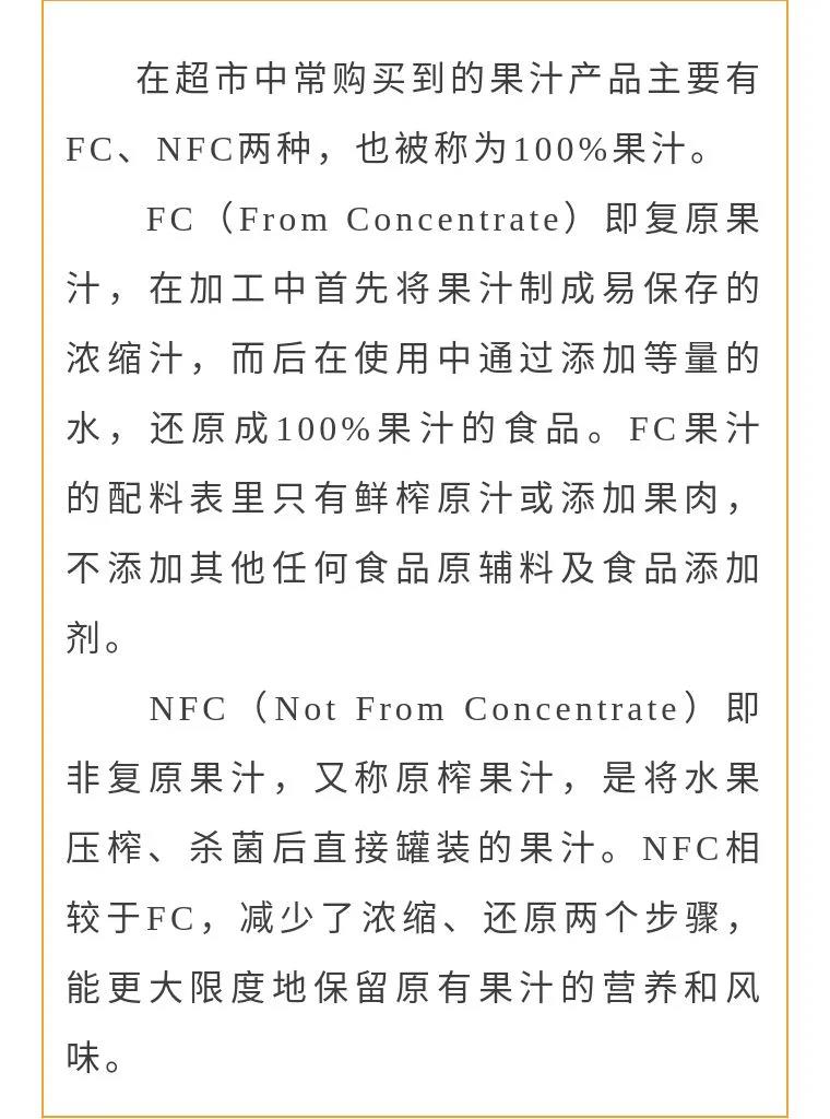 随着果汁饮品的盛行,市场上带“果汁”字样的食品琳琅满目让人挑花了眼,100%果汁、果汁饮料、NFC果汁...各式各样的“果汁”到底有什么区别?我们又该如何选择呢?