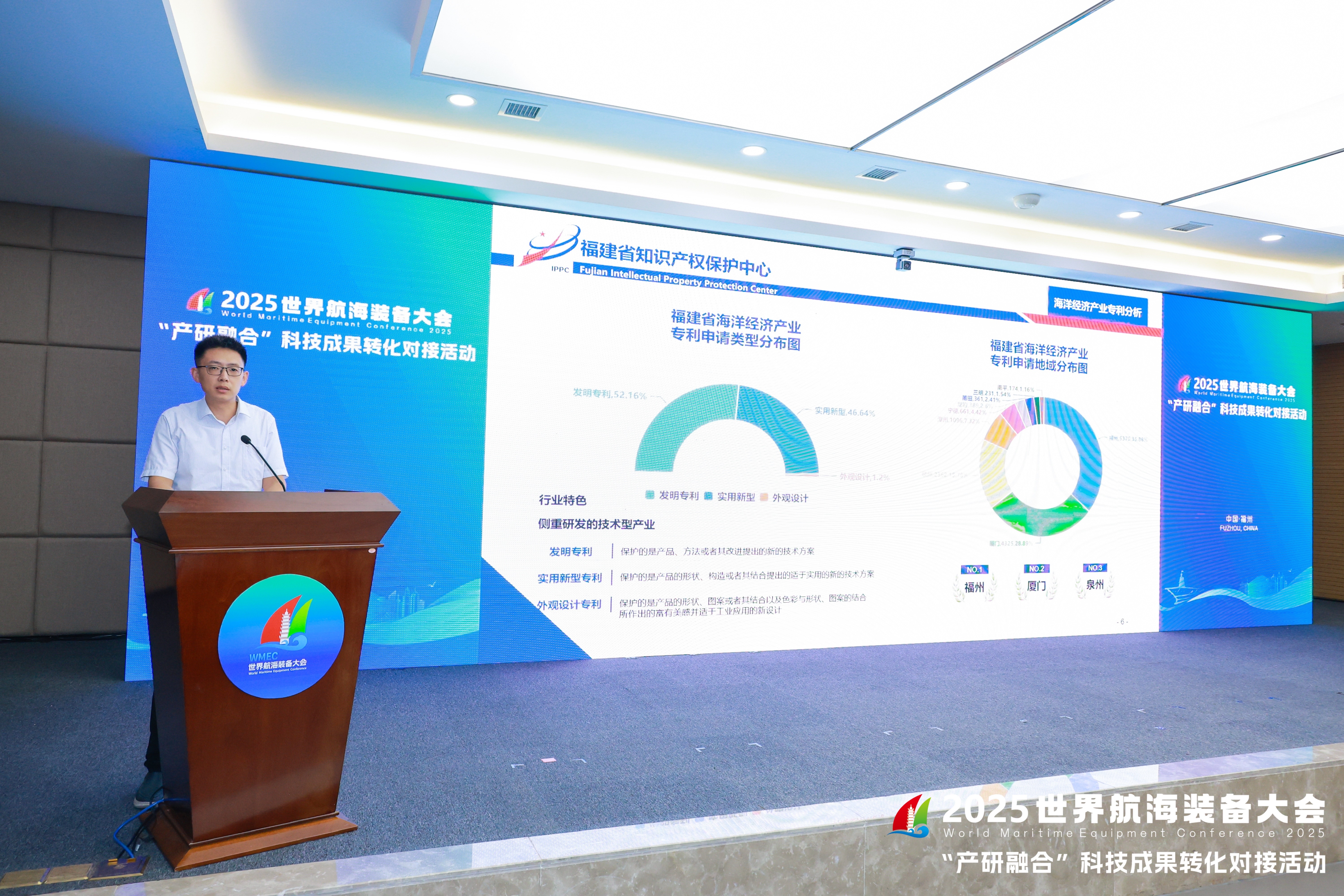 为充分发挥知识产权制度供给和技术供给的双重作用,有效利用专利的权益纽带和信息链接功能,促进技术、资本、人才等资源要素高效配置和有机聚合,本次活动现场还发布了国家专利导航服务综合平台高校和科研机构存量专利盘活系统里收录的“双五星”涉海专利。福建作为沿海省份,十分重视挖掘“蓝色经济”发展潜力,截至2025年10月提交了海洋经济产业专利申请1.49万件,其中发明专利的占比过半,实用新型专利与发明专利的占比相当,外观设计的占很小,可见福建省海洋经济产业比较侧重研发;而从地市角度看,福州市的海洋经济产业专利申请量为5370件,位居全省首位,可见福州海洋经济产业的创新实力较为领先。据统计,截至10月13日,我省进入盘活系统的专利共4.5万件;其中具有可转化性的专利2.9万件,其中涉及海洋经济产业的专利785件,双五星专利40件。本次活动重点推介了福建省农业科学院畜牧兽医研究所的“大米草收割加工机械船舶及其大米草收割加工方法”等7项专利,通过评价模型及人工智能实现了供需精准匹配,给出了推荐转移转化企业名录,加快推动技术含量高、市场前景好的海洋经济产业高价值专利项目落地实施,进一步扩大了高价值专利产业化的实施范围和成效。
